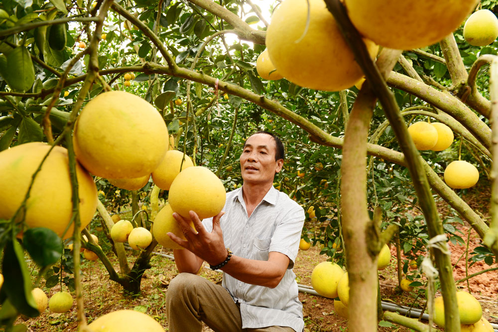 Người dân thôn Thượng Vũ, xã Quý Sơn (Lục Ngạn) chăm sóc bưởi ngọt. Ảnh: Thế Đại