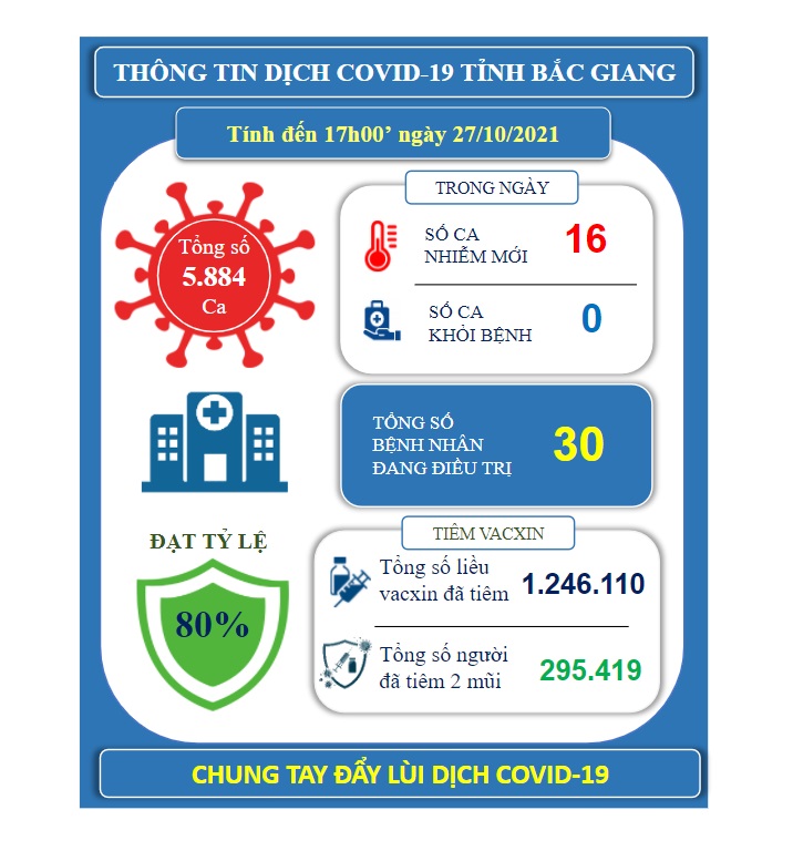 Theo Ban chỉ đạo phòng, chống dịch COVID-19 tỉnh, đến 17h00’ ngày 27/10/2021, trên địa bàn tỉnh Bắc Giang ghi nhận 16 ca mắc mới COVID-19 (trường hợp F0). Tính đến nay, toàn tỉnh có 5.884 trường hợp F0.