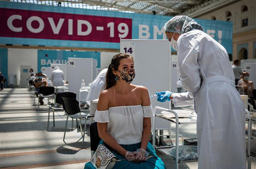 Nhân viên y tế tiêm vaccine Sputnik V ngừa COVID-19 cho người dân tại Moskva, Nga ngày 7/7/2021. Ảnh: AFP/TTXVN