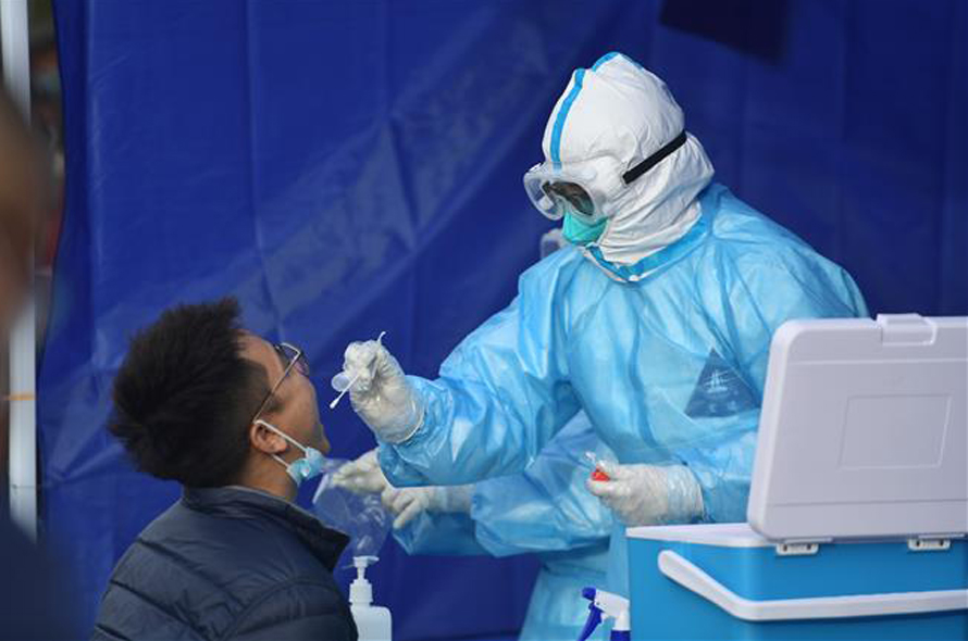 Nhân viên y tế lấy mẫu xét nghiệm COVID-19 cho người dân tại Thanh Hải, Trung Quốc. Ảnh: THX/TTXVN