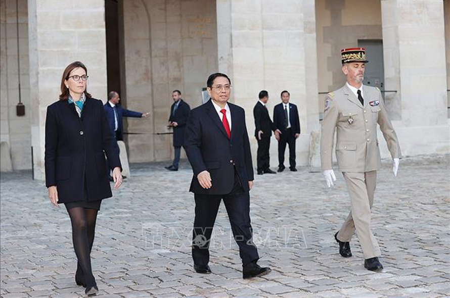 Bà Amélie de Montchalin, Bộ trưởng Chuyển đổi và Hành chính Công Pháp chủ trì lễ đón chính thức Thủ tướng Phạm Minh Chính, tại Điện Invalides ở Thủ đô Paris. Ảnh: Dương Giang/TTXVN