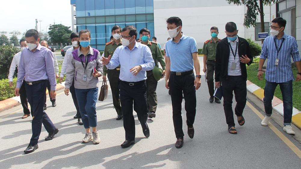 Đồng chí Phan Thế Tuấn kiểm tra công tác phòng, chống dịch tại một số DN thuộc KCN Quang Châu. |