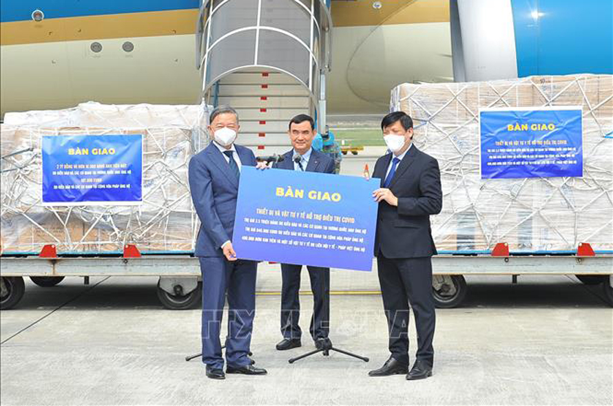 Đoàn bàn giao cho Bộ trưởng Bộ Y tế Nguyễn Thanh Long, đại diện Bộ Y tế, số thiết bị và vật tư y tế hỗ trợ điều trị COVID-19, trị giá 3,5 triệu bảng Anh và 640.000 euro do kiều bào, các cơ quan tại Vương quốc Anh và tại Cộng hòa Pháp ủng hộ cùng hơn 400.000 bơm kim tiêm và một số vật tư y tế do Liên hội Y tế Pháp-Việt ủng hộ.