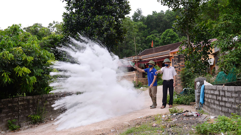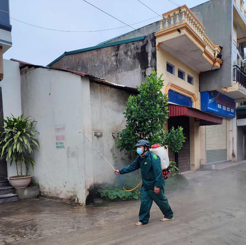 Lực lượng chức năng thị trấn Bố Hạ (Yên Thế) phu hoá chất vệ sinh môi trường.