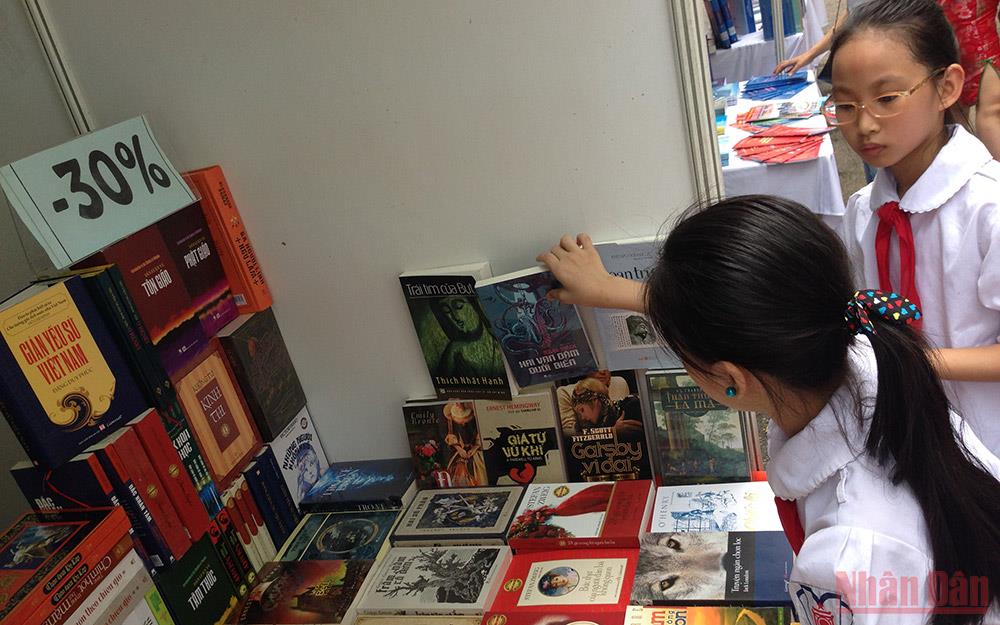 Xây dựng văn hóa đọc sâu rễ bền gốc từ lứa tuổi nhỏ là nhiệm vụ quan trọng. (Ảnh: Các em học sinh tham khảo sách tại khu trưng bày nhân Ngày Sách Việt Nam của Thư viện Quốc gia)