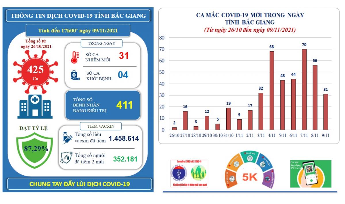 Theo Ban chỉ đạo phòng, chống dịch COVID-19 tỉnh, đến 17h00’ ngày 09/11/2021, trên địa bàn tỉnh Bắc Giang ghi nhận 31 ca mắc mới COVID-19 (ca F0). Như vậy, từ ngày 26/10/2021 đến nay, trên địa bàn tỉnh đã ghi nhận 425 ca F0. Cụ thể:
