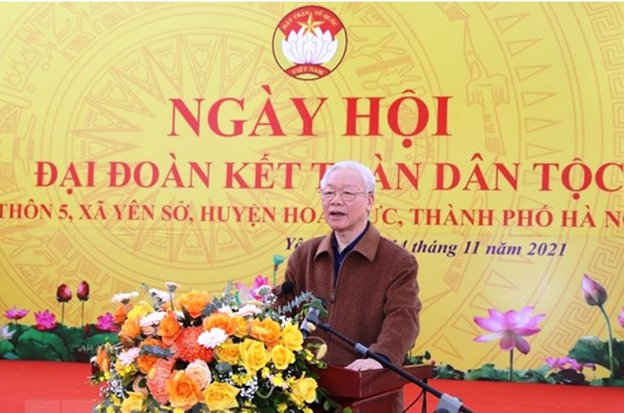 Vui mừng được về dự Ngày hội Đại đoàn kết toàn dân tộc với cán bộ và nhân dân thôn 5, Tổng Bí thư Nguyễn Phú Trọng nêu rõ, mục đích của ngày hội là nhằm xây dựng, củng cố và phát huy quyền làm chủ của nhân dân; tăng cường sức mạnh khối Đại đoàn kết dân tộc và nâng cao vai trò của Mặt trận Tổ quốc Việt Nam trong thời kỳ mới. Kết quả của ngày hội sẽ đem lại những giá trị tinh thần, làm giàu thêm ý chí cách mạng, tôn vinh sức mạnh cộng đồng, góp phần thực hiện thắng lợi các nhiệm vụ chính trị, phát triển kinh tế, văn hóa - xã hội ở từng thôn, bản, làng, tổ dân phố, cụm dân cư,... trong cả nước.