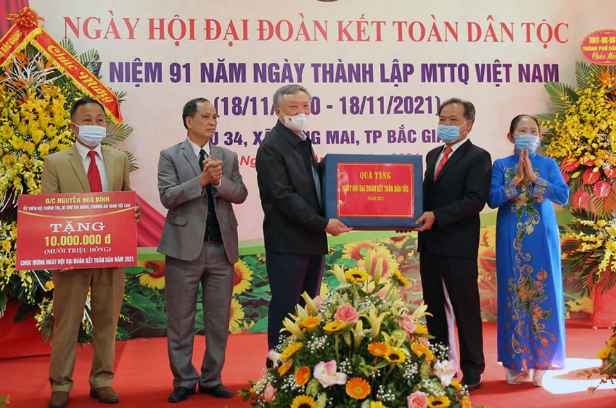 Tại Ngày hội, đồng chí Nguyễn Hòa Bình tặng hoa, quà cho khu và trao 30 suất quà cho 30 hộ gia đình hoàn cảnh khó khăn trên địa bàn xã Song Mai, tổng trị giá 60 triệu đồng.