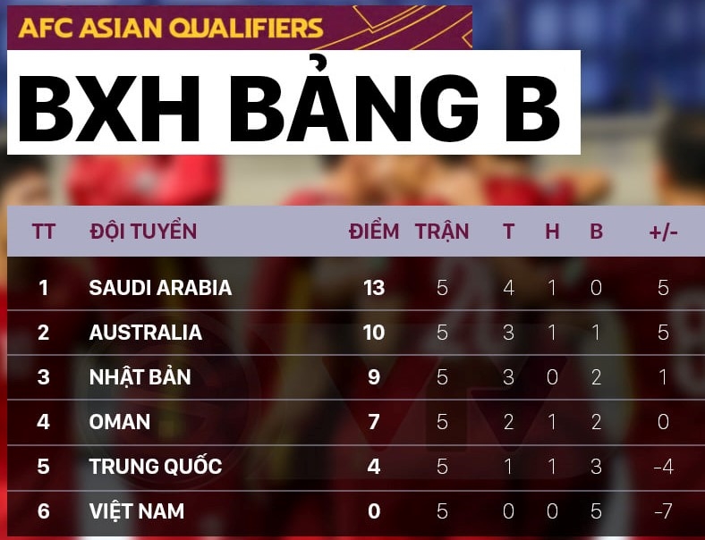 | Bảng xếp hạng bảng B, vòng loại thứ 3 World Cup 2022 khu vực châu Á. Ảnh: VTV. |