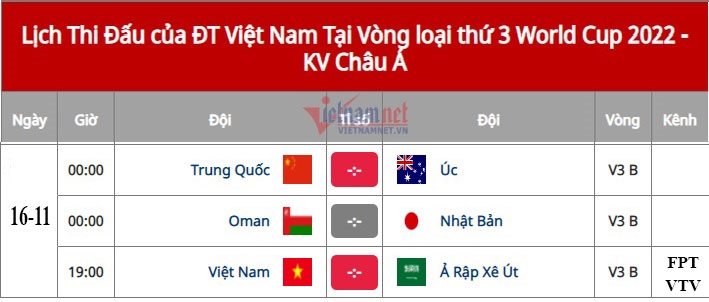 | Lịch thi đấu bảng B, vòng loại thứ 3 World Cup 2022 khu vực châu Á. Ảnh: Vietnamnet.vn. |