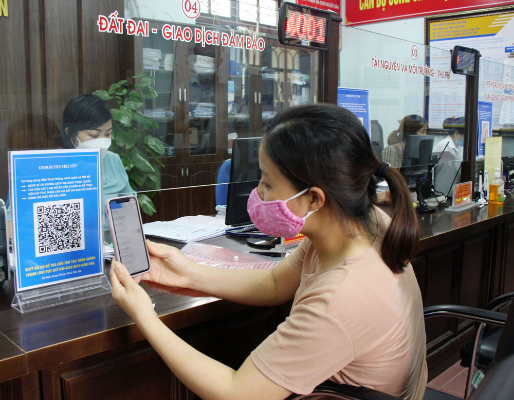 Người dân quét mã QR Code tra cứu thủ tục hành chính và đánh giá mức độ hài lòng tại bộ phận một cửa huyện Việt Yên.