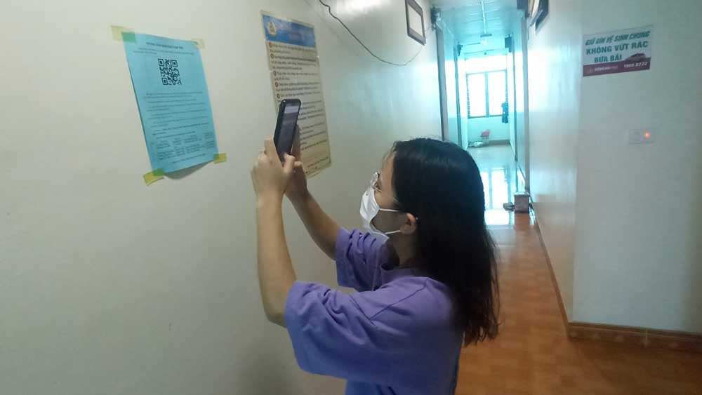 Công nhân Công ty TNHH Luxshare ICT- Việt Nam quét mã khai báo thông tin tạm trú ban đầu tại nhà trọ trên địa bàn xã Tăng Tiến (Việt Yên).