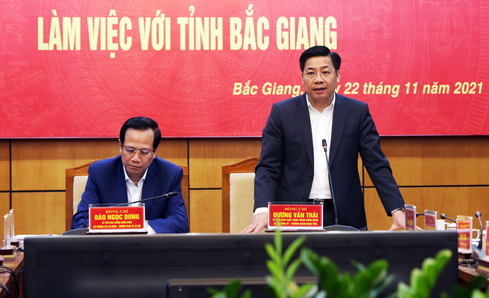 Phát biểu tại buổi làm việc, đồng chí Đào Ngọc Dung đánh giá cao tỉnh Bắc Giang đã vượt qua khó khăn của đại dịch Covid-19, có bước phát triển đột phá về tốc độ tăng trưởng kinh tế, thu ngân sách, phát triển công nghiệp. Trong khó khăn chung, Đảng bộ, chính quyền tỉnh Bắc Giang đã quan tâm thực hiện tốt công tác an sinh xã hội; quan tâm đào tạo nguồn nhân lực chất lượng cao; chăm lo đời sống cho người nghèo, người lao động.