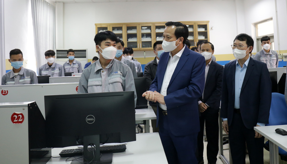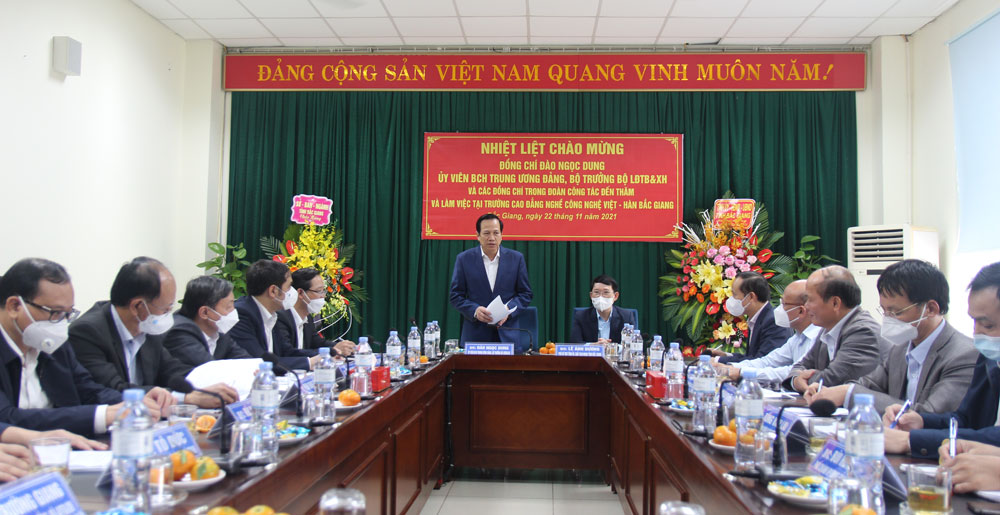 Trước đó, Bộ trưởng Bộ LĐTBXH đến thăm Trường Cao đẳng nghề công nghệ Việt - Hàn. Đây là một trong những trường đào tạo nghề uy tín, chất lượng của cả nước. Năm 2021, nhà trường đào tạo 21 nghề, với tổng số 5,3 nghìn học sinh, sinh viên. Kết quả tuyển sinh hàng năm đều vượt chỉ tiêu, số người có nhu cầu học nghề vượt quy mô đào tạo. Nhà trường đã thiết lập quan hệ đối tác bền vững với hơn 150 DN; tỷ lệ sinh viên có việc làm ngay sau khi ra trường đạt hơn 94%.