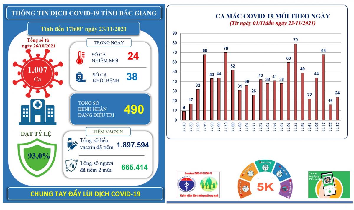 Theo Sở Y tế, đến 17h00’ ngày 23/11/2021, trên địa bàn tỉnh Bắc Giang ghi nhận 24 ca mắc mới COVID-19 (ca F0). Từ ngày 26/10/2021 đến nay, trên địa bàn tỉnh đã ghi nhận 1.007 ca F0. Cụ thể:
