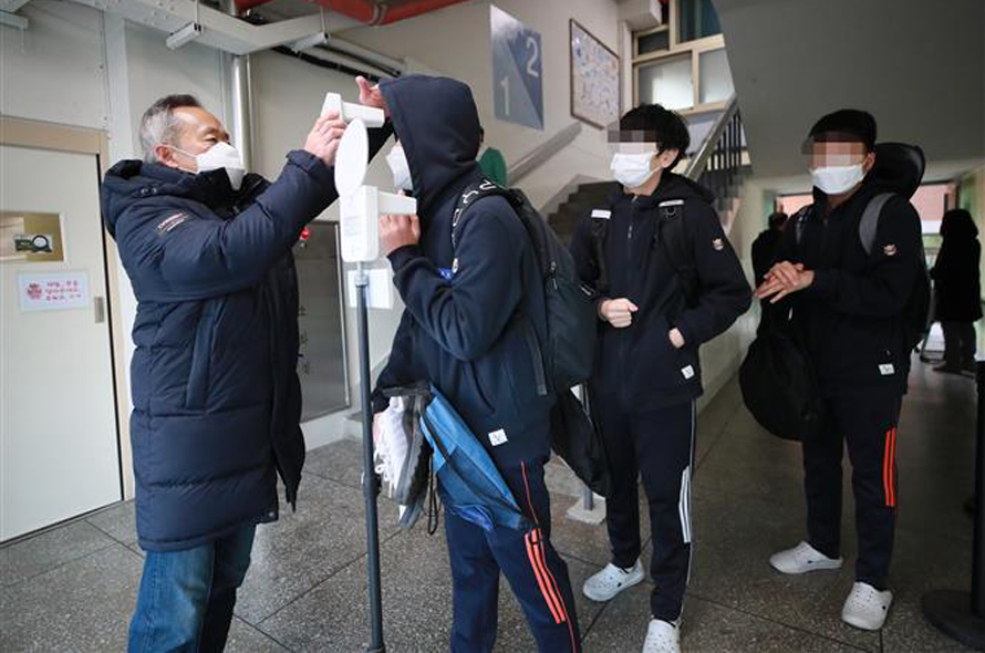 Kiểm tra thân nhiệt nhằm ngăn chặn sự lây lan của dịch COVID-19 tại một trường học ở Seoul, Hàn Quốc, ngày 22/11/2021. Ảnh: YONHAP/TTXVN