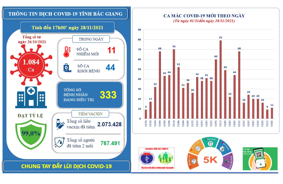 Theo Sở Y tế, đến 17h00’ ngày 28/11/2021, trên địa bàn tỉnh Bắc Giang ghi nhận 11 ca mắc mới COVID-19 (ca F0). Từ ngày 26/10/2021 đến nay, trên địa bàn tỉnh đã ghi nhận 1.084 ca F0. Cụ thể: