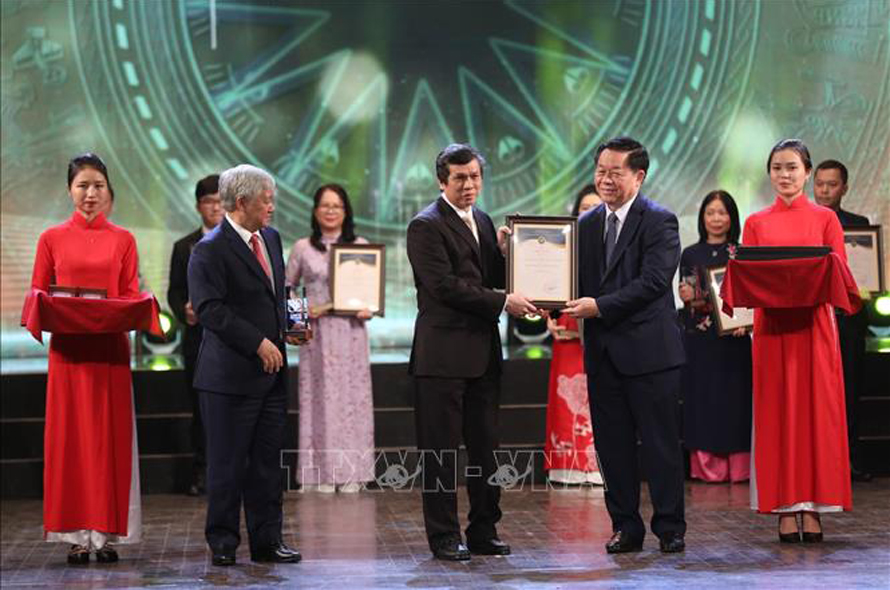 Bí thư Trung ương Đảng, Trưởng Ban Tuyên giáo Trung ương Nguyễn Trọng Nghĩa và Bí thư Trung ương Đảng, Chủ tịch Ủy ban Trung ương Mặt trận Tổ quốc Việt Nam Đỗ Văn Chiến trao giải Nhất cho đại diện nhóm tác giả Ban biên tập Ảnh (TTXVN). Ảnh: Minh Quyết/TTXVN