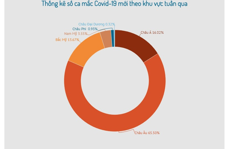Những con số này vẫn chiếm phần lớn số ca mắc mới và tử vong ghi nhận trên toàn cầu. Theo đó, thế giới ghi nhận thêm 3.812.422 ca bệnh (tăng 2%) và 47.936 ca tử vong (giảm 4%) trong tuần qua, trong đó châu Âu chiếm tới hơn 65,5% ca mắc mới và hơn 55,6% số người không qua khỏi.