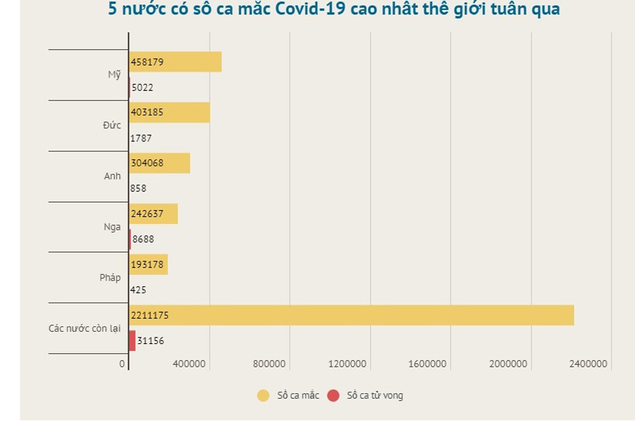 Diễn biến dịch bệnh ở châu Âu vẫn rất đáng lo ngại khi trong số 5 nước có số ca mắc mới dẫn đầu thế giới tuần qua, châu lục này có tới 4 quốc gia góp mặt. Ngoại trừ Mỹ vẫn dẫn đầu thế giới với 458.179 ca mắc mới (giảm sâu 31%), 4 nước châu Âu gồm: Đức, Anh, Nga và Pháp xếp sau trong danh sách này.