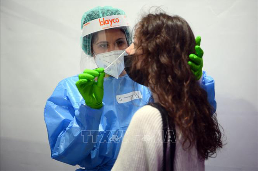 Nhân viên y tế lấy mẫu xét nghiệm COVID-19 cho người dân tại Barcelona, Tây Ban Nha ngày 27/3/2021. Ảnh: AFP/TTXVN