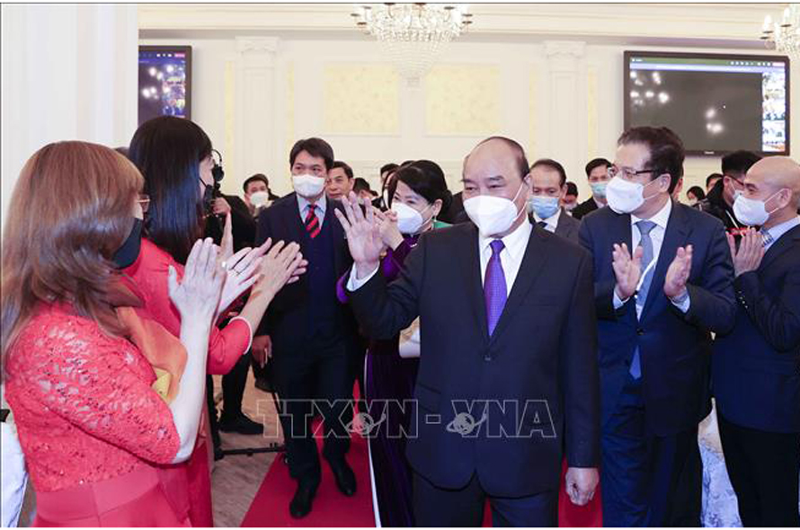 Chiều 2/12/2021 (theo giờ địa phương), tại Thủ đô Moskva, Liên bang Nga, Chủ tịch nước Nguyễn Xuân Phúc gặp gỡ đại diện cộng đồng Việt Nam tại Liên bang Nga. Ảnh: Thống Nhất/TTXVN