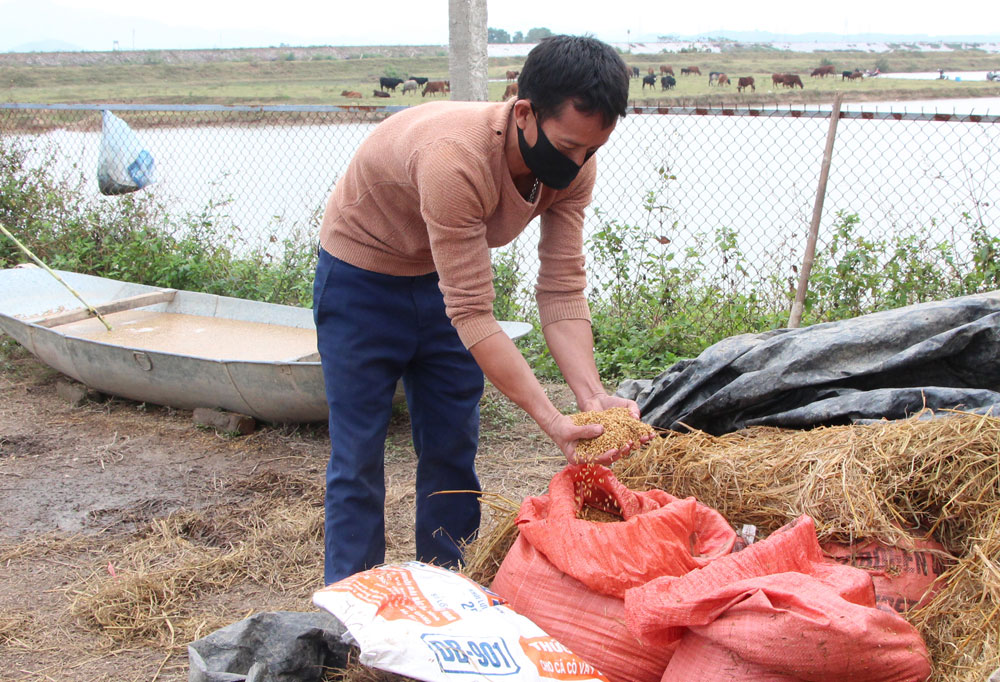 Gia đình ông Trần Văn Phú, xã Lãng Sơn (Yên Dũng) ủ thóc mầm bổ sung thức ăn cho cá.