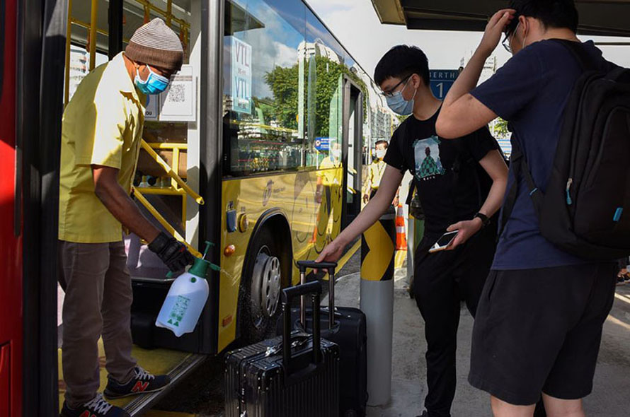 Khử khuẩn hành lý của hành khách di chuyển tới Malaysia thông qua VTL giữa Singapore và Malaysia. (Ảnh: Reuters)