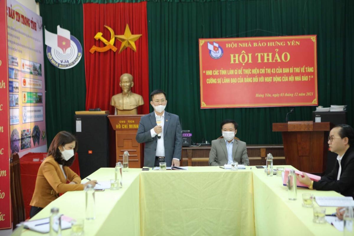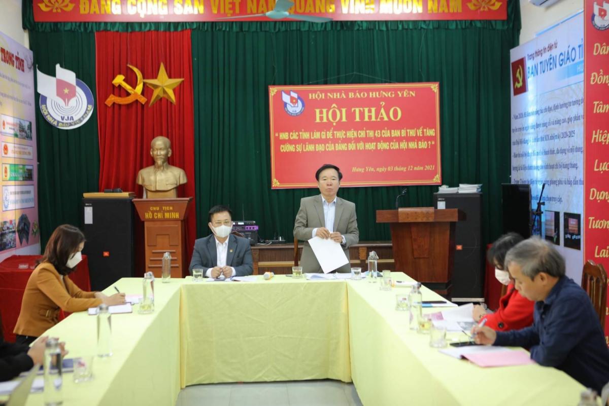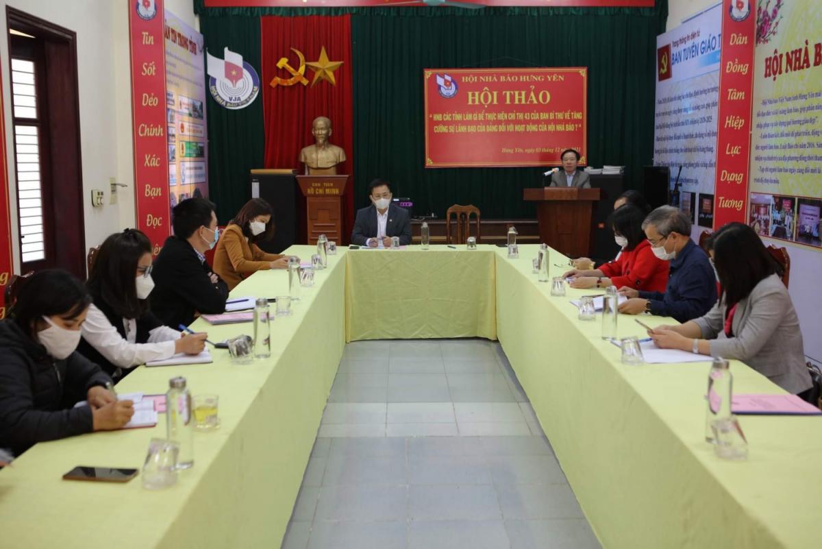 Ngày 3/12, Hội Nhà báo tỉnh Hưng Yên tổ chức Hội thảo "HNB các tỉnh làm gì để thực hiện Chỉ thị 43 của Ban Bí thư về tăng cường sự lãnh đạo của Đảng đối với hoạt động của Hội Nhà báo?" tham gia buổi Hội thảo có đại biểu đại diện thường trực hội nhà báo các tỉnh khu vực đồng bằng duyên hải Bắc Bộ và lãnh đạo một số cơ quan báo chí trong tỉnh.