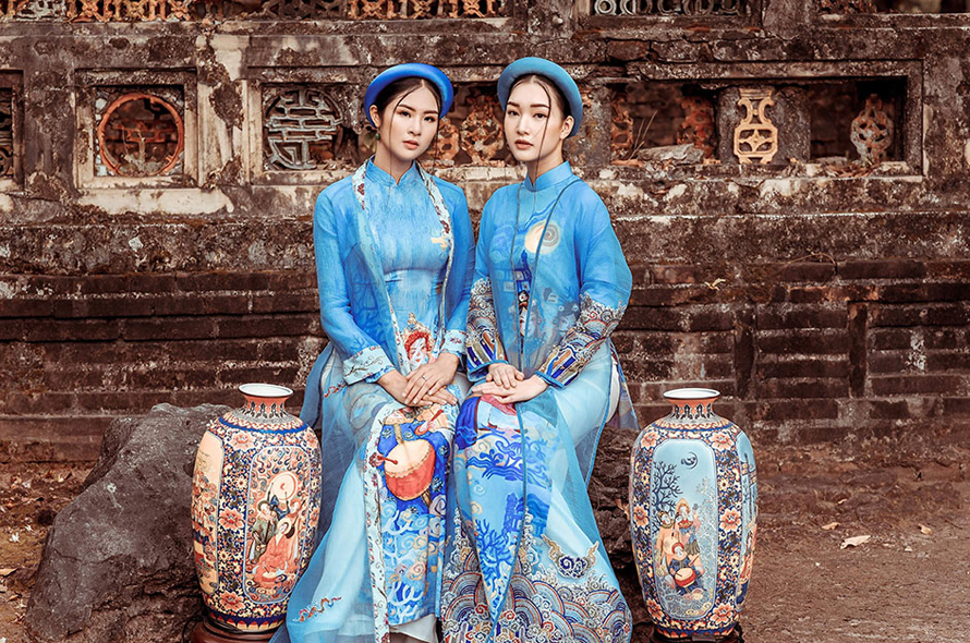 Bộ sưu tập áo dài của hoa hậu Ngọc Hân khai thác các họa tiết trang trí trong kiến trúc, mỹ thuật cổ Huế và hình ảnh nhã nhạc cung đình. (Ảnh: Ngọc Hân cung cấp)