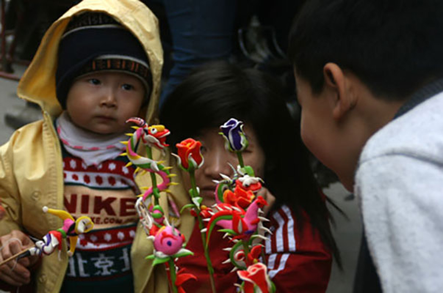 Em bé thích thú với các loại tò he ở một hội chợ quê truyền thống.
