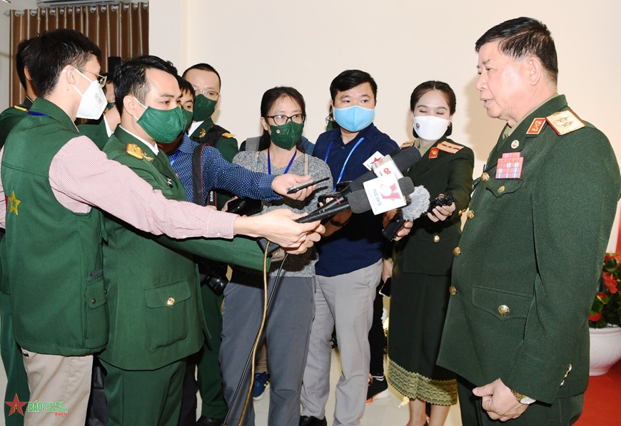 Trung tướng Vongkham Phommakone, Ủy viên Trung ương Đảng, Thứ trưởng Bộ Quốc phòng Lào trả lời phỏng vấn báo chí nhân dịp diễn ra chương trình Giao lưu hữu nghị quốc phòng biên giới Việt Nam-Lào lần thứ nhất. Ảnh Qdnd.vn. |