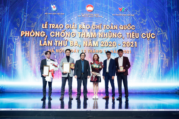 Nhóm tác giả cùng Quyền Tổng biên tập - Lê Anh Ðạt tại Lễ trao Giải Báo chí toàn quốc phòng, chống tham nhũng,