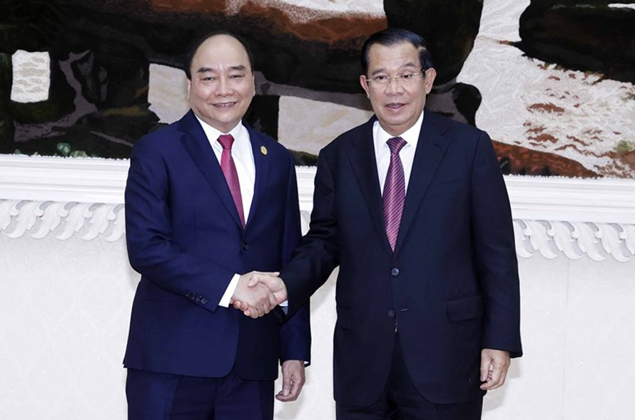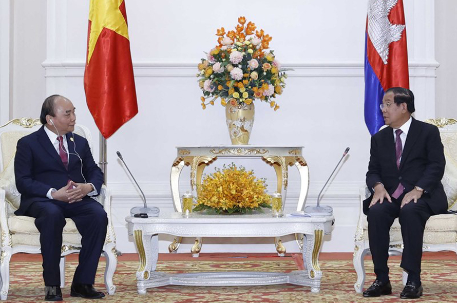 Chủ tịch nước Nguyễn Xuân Phúc bày tỏ vui mừng gặp lại Thủ tướng Hun Sen, người bạn thân thiết lâu năm của Lãnh đạo và nhân dân Việt Nam; chúc mừng Chính phủ và nhân dân Campuchia tiếp tục đạt được những thành tích ấn tượng về phát triển kinh tế-xã hội cũng như trong công tác phòng, chống đại dịch Covid-19, góp phần quan trọng vào sự lớn mạnh và vị thế ngày càng tăng của Vương quốc Campuchia ở khu vực và trên trường quốc tế.