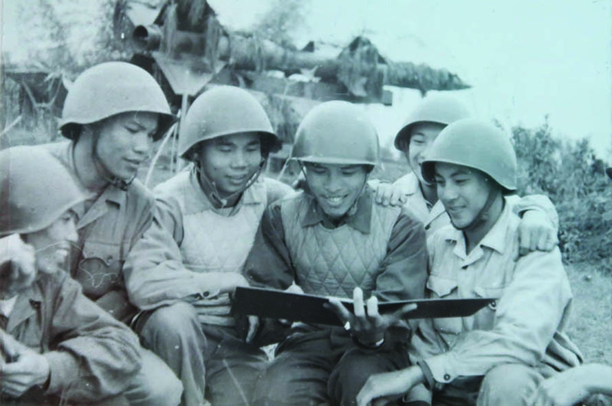 Ông Nguyễn Quang Hùng (ngồi giữa, tay cầm sổ rút kinh nghiệm chiến đấu) khi còn là sĩ quan điều khiển cùng với kíp chiến đấu Tiểu đoàn 62 tại trận địa Cổ Nhuế, Hà Nội, năm 1967. (Ảnh: nhân vật cung cấp)