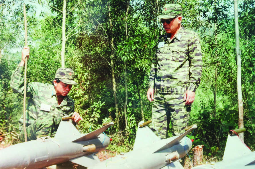 Nguyên Phó Tham mưu trưởng Quân chủng PK-KQ Nguyễn Quang Hùng (đứng) kiểm tra mục tiêu bay cho pháo cao xạ năm 1994. (Ảnh: nhân vật cung cấp)