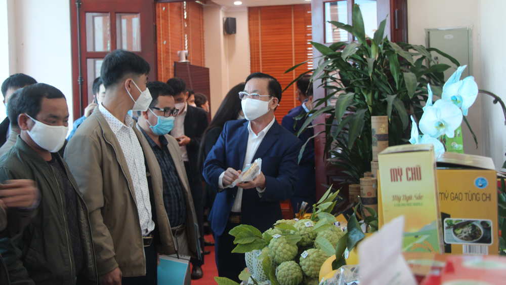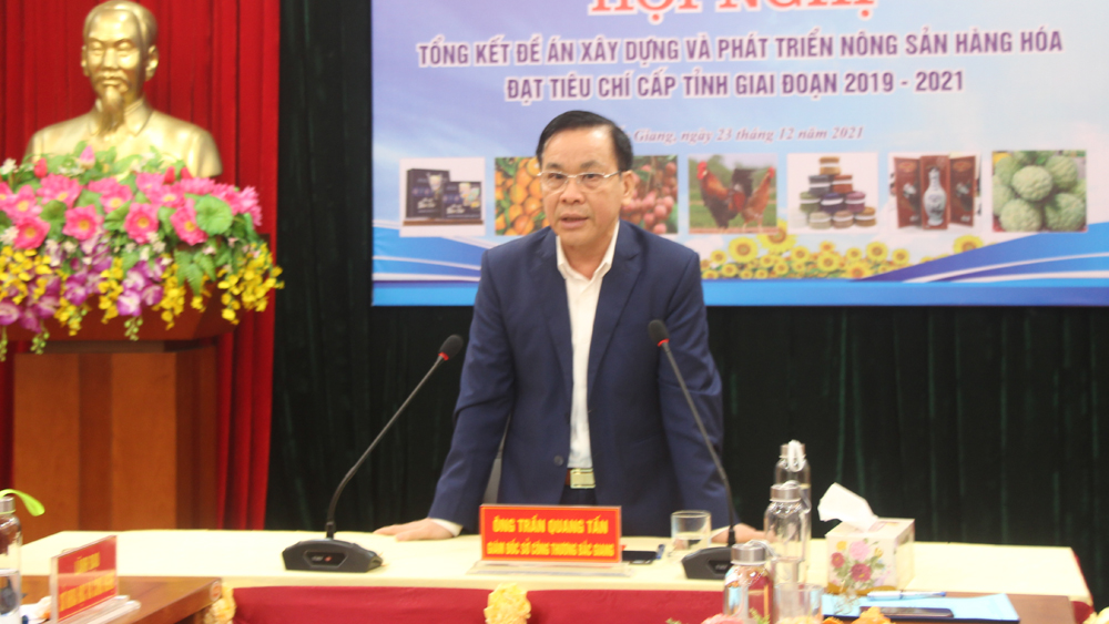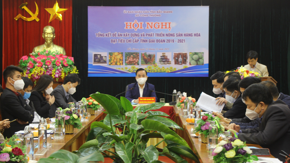 Đại diện lãnh đạo Sở Công Thương báo cáo tóm tắt quá trình thực hiện đề án. Trong đó nêu rõ, đề án có sự tham gia của 4 sản phẩm đã đạt tiêu chí nông sản hàng hóa cấp tỉnh (vải thiều Lục Ngạn, gà đồi Yên Thế, chè bản Ven và mỳ Chũ); đồng thời phấn đấu xây dựng 4 sản phẩm đạt tiêu chí nông sản hàng hóa cấp tỉnh (rượu làng Vân, nấm Lạng Giang, cam bưởi Lục Ngạn và na dai Lục Nam).