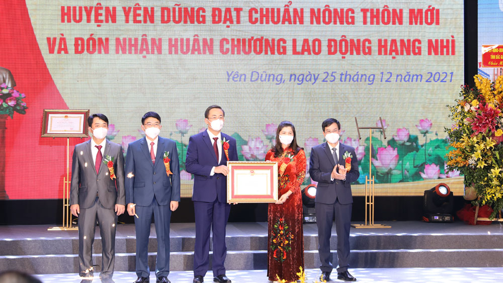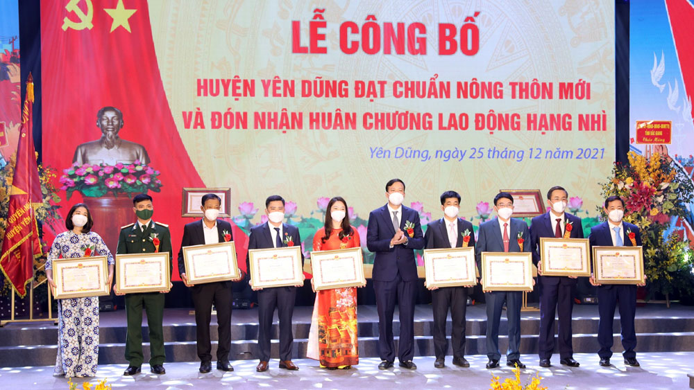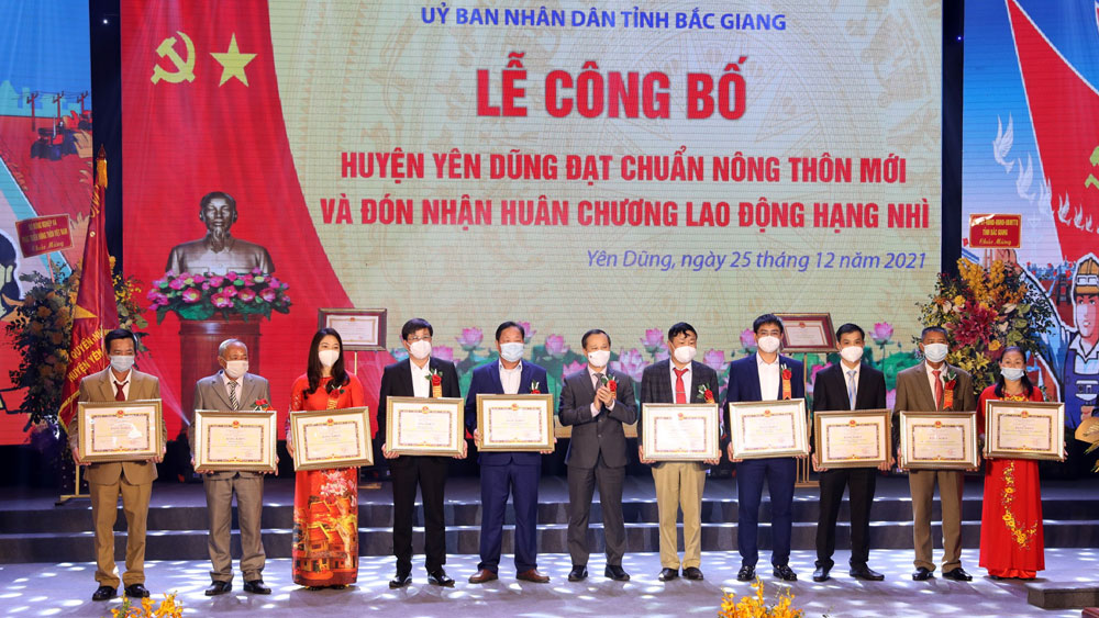Đến năm 2021, tỉnh có thêm huyện Yên Dũng được Thủ tướng Chính phủ công nhận đạt chuẩn NTM, TP Bắc Giang được Công nhận hoàn thành nhiệm vụ xây dựng NTM. Với 6 đơn vị cấp huyện đạt chuẩn và hoàn thành nhiệm vụ xây dựng NTM, Bắc Giang tiếp tục giữ vững vị thế là tỉnh thuộc tốp đầu khu vực Trung du miền núi phía Bắc về xây dựng NTM. Trong kết quả chung của tỉnh có đóng góp quan trọng của Đảng bộ, chính quyền và nhân dân huyện Yên Dũng.