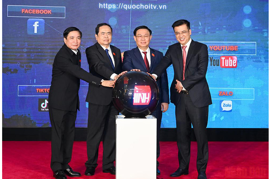 Chủ tịch Quốc hội Vương Đình Huệ cùng các đại biểu thực hiện nghi thức ra mắt Hệ sinh thái số Truyền hình Quốc hội Việt Nam. (Ảnh: Duy Linh )