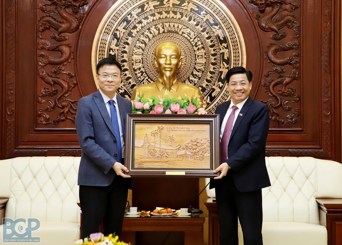 Nhân dịp này, Bí thư Tỉnh ủy Dương Văn Thái đã tặng quà lưu niệm cho Bộ trưởng Bộ Tư pháp Lê Thành Long và Đoàn công tác.