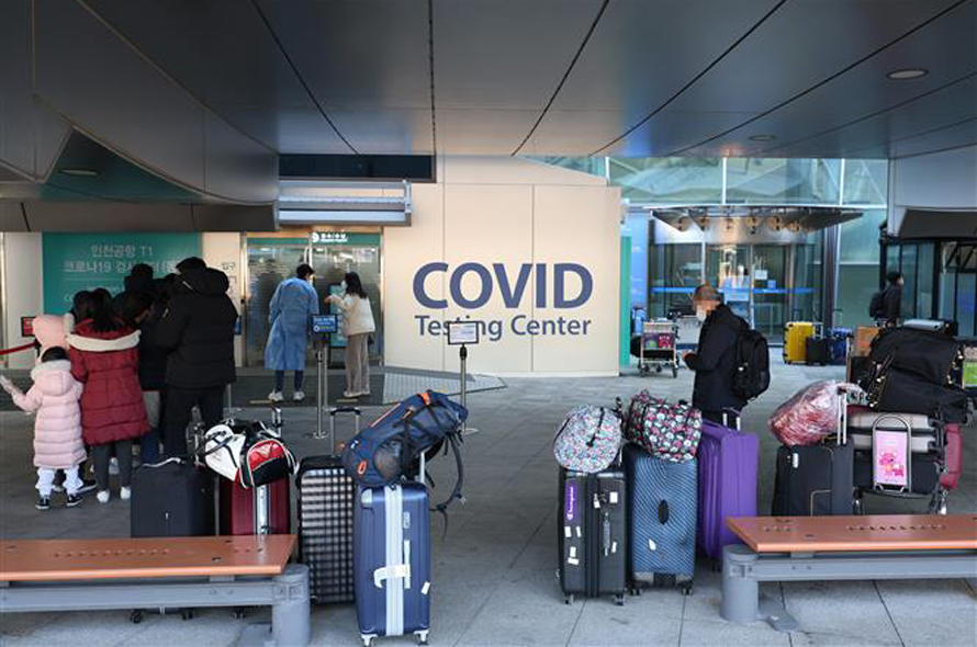 Hành khách chờ xét nghiệm COVID-19 tại sân bay quốc tế Incheon, phía tây thủ đô Seoul, Hàn Quốc, ngày 8/1/2022. Ảnh: Yonhap/ TTXVN
