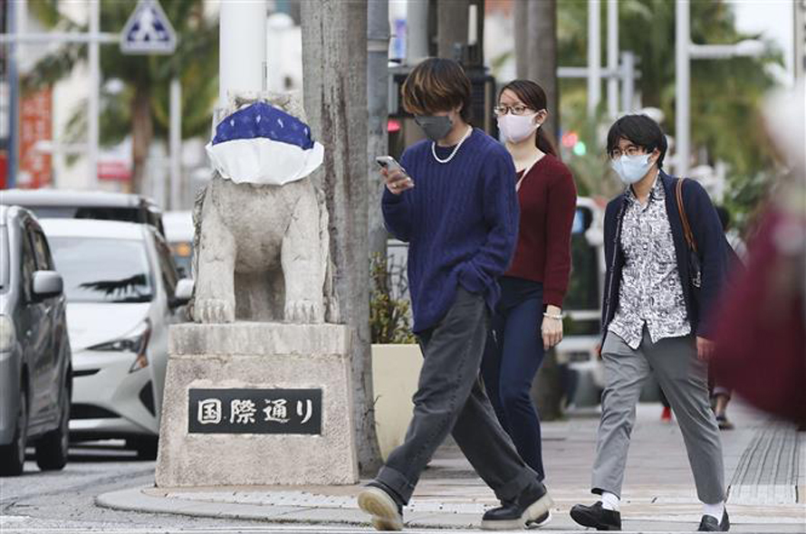 Người dân đeo khẩu trang phòng lây nhiễm COVID-19 tại Naha, tỉnh Okinawa, Nhật Bản. Ảnh: Kyodo/TTXVN