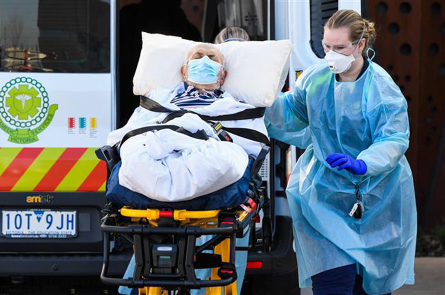 Nhân viên y tế chuyển bệnh nhân COVID-19 vào bệnh viện tại thành phố Melbourne, Australia. Ảnh: AFP/TTXVN