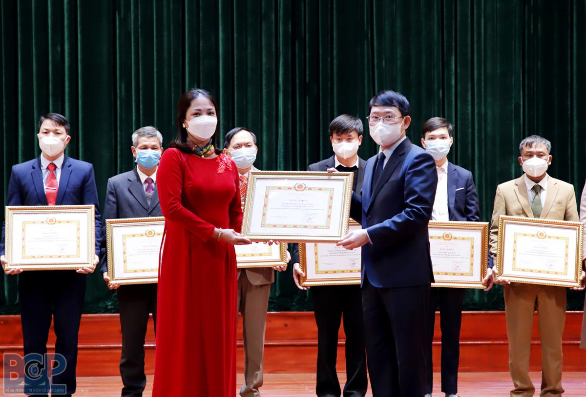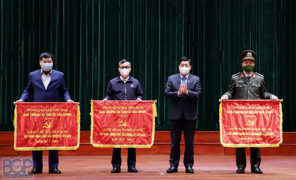 Tại hội nghị, Ban Thường vụ Tỉnh ủy trao tặng Bằng khen cho 03 Đảng bộ cấp huyện đạt tiêu chuẩn “Hoàn thành xuất sắc nhiệm vụ” tiêu biểu năm 2021; 02 Đảng bộ cấp huyện có thành tích tiêu biểu trong công tác lãnh đạo, chỉ đạo phòng, chống dịch Covid-19 năm 2021. Tặng Cờ thi đua cho 3 tổ chức cơ sở Đảng và tặng Bằng khen cho 02 tổ chức cơ sở Đảng, 15 chi bộ trực thuộc Đảng ủy cơ sở, 21 đảng viên đạt tiêu chuẩn “Hoàn thành xuất sắc nhiệm vụ” tiêu biểu 5 năm liền.