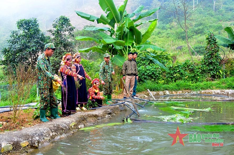 Cán bộ, chiến sĩ Đồn Biên phòng Pa Ủ, Bộ đội Biên phòng tỉnh Lai Châu, hướng dẫn đồng bào làm mô hình kinh tế V.A.C. Ảnh: TRUNG HIẾU