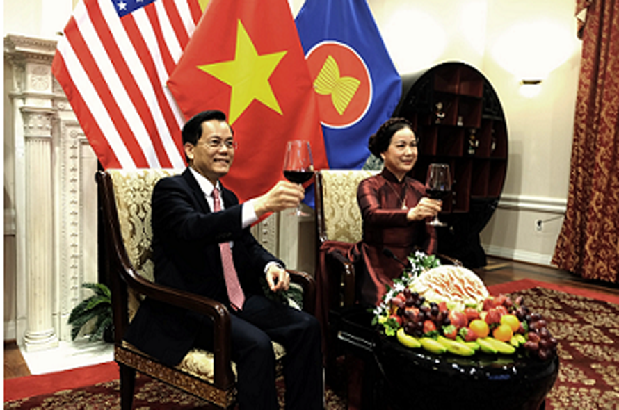 Đại sứ Việt Nam tại Mỹ Hà Kim Ngọc và Phu nhân Nguyễn Thị Phương Liên chúc Tết các khách mời. (Ảnh: baoquocte.vn)