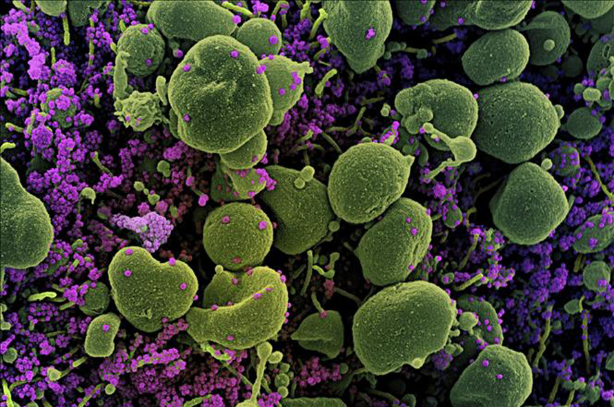 Hình ảnh dưới kính hiển vi do Viện nghiên cứu bệnh truyền nhiễm và dị ứng quốc gia Mỹ cung cấp cho thấy hình ảnh virus SARS-CoV-2 (màu tím) trong tế bào (màu xanh) của bệnh nhân COVID-19. Ảnh: AFP/TTXVN