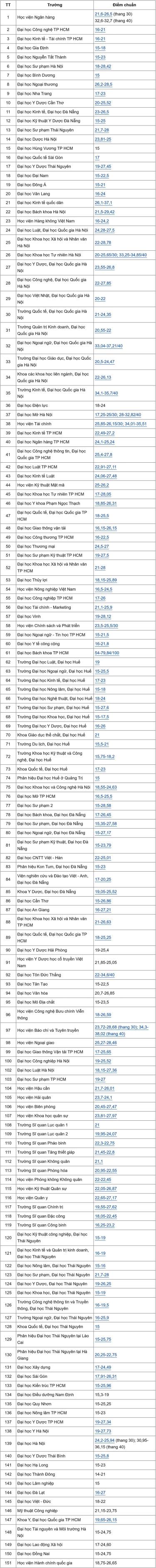 Hầu hết đại học đã công bố điểm chuẩn, từ 15 đến 29,42. Các ngành đào tạo giáo viên, nhóm Công nghệ thông tin, Logistics vẫn hấp dẫn nhất. Trong các trường đã công bố điểm chuẩn, mức cao nhất đang thuộc về Đại học Bách khoa Hà Nội. Trường đưa ra mức 29,42 điểm với ngành Khoa học máy tính (IT1). Đây cũng là mức điểm chuẩn kỷ lục của Bách khoa Hà Nội trong 5 năm qua.