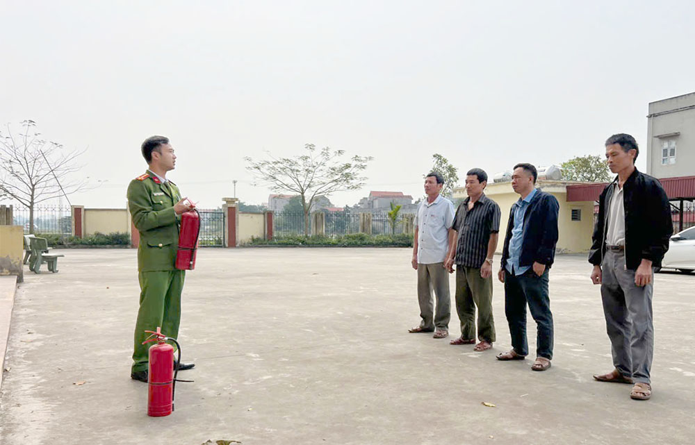 Cán bộ Phòng Cảnh sát phòng cháy, chữa cháy và cứu nạn, cứu hộ (Công an tỉnh) hướng dẫn kỹ năng xử lý cháy nổ cho thành viên tổ bầu cử ở xã Đồng Việt. |