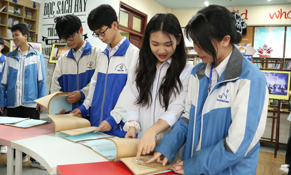 Học sinh hào hứng tìm hiểu tư liệu lịch sử tại trưng bày. |